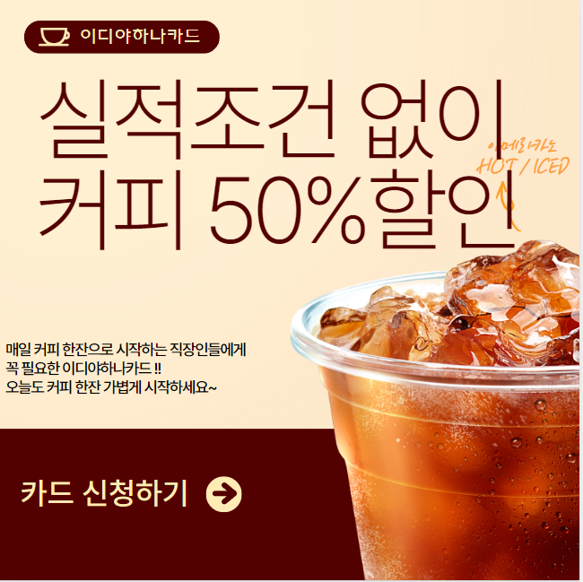 이디야 하나카드를 통해 매월 할인 혜택과 음료 쿠폰을 받아보세요.