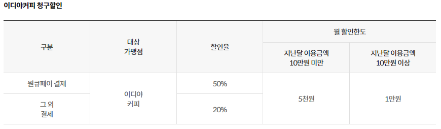 - 이디야 하나카드를 사용하여 결제하면 매월 일정 금액까지 50% 할인을 받을 수 있습니다. 이 혜택은 원큐페이 등록 후 결제 시 적용됩니다.